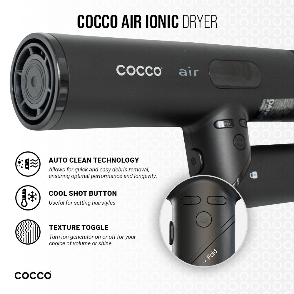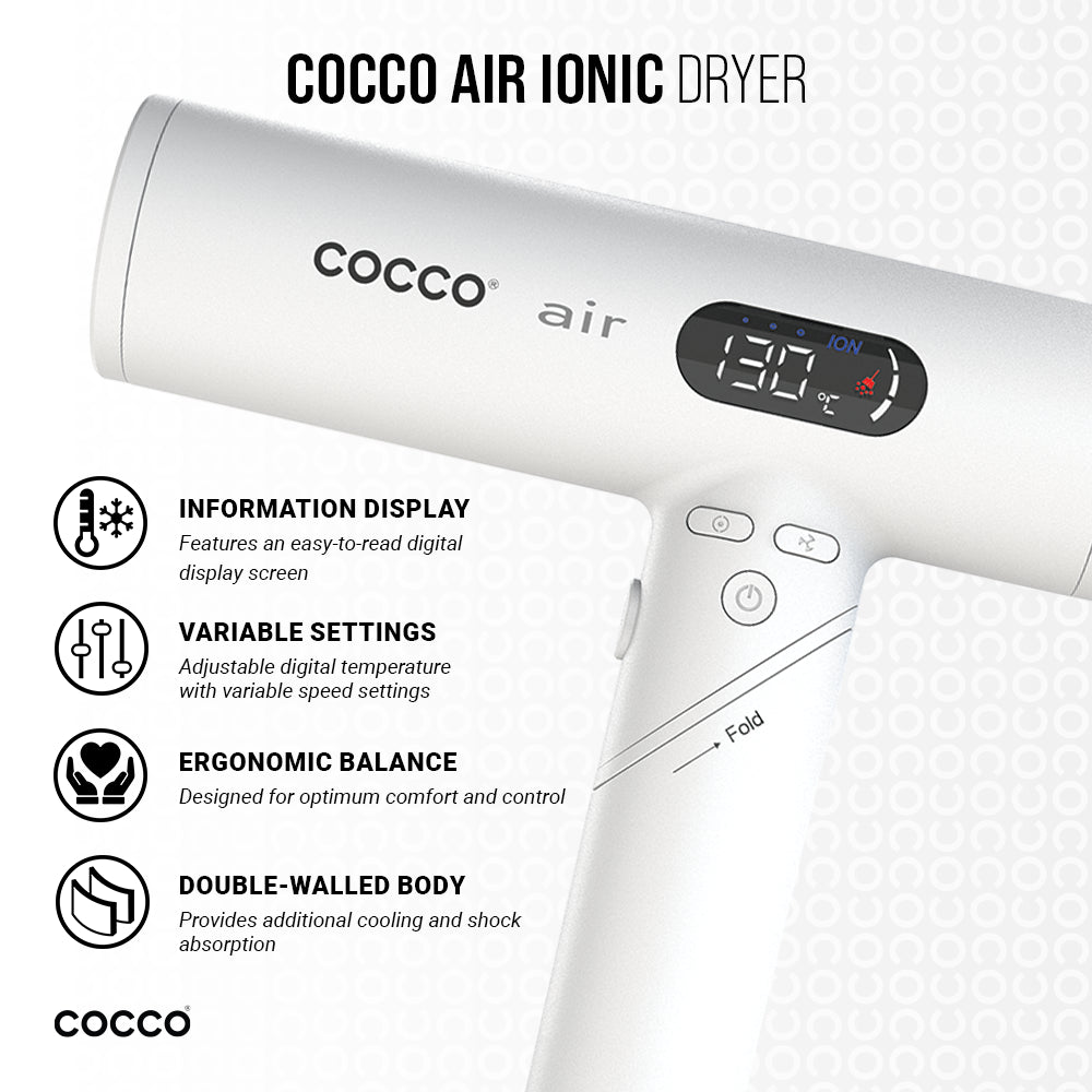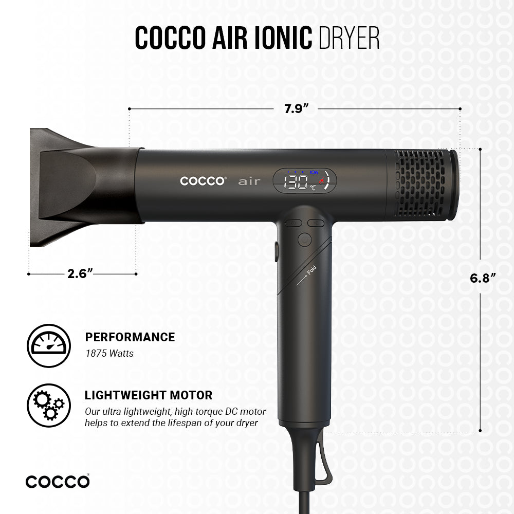 The Cocco Air Ionic Dryer is an ultra-lightweight dryer that competes with many heavier models in performance. It features a high-torque brushless DC motor, delivering maximum airflow in a lightweight package. it delivers professional-quality results while prioritizing convenience and efficiency. Suitable for various styling needs, it is ergonomically designed for optimal balance and comfort. The foldable design allows you to travel with convenience and ease.